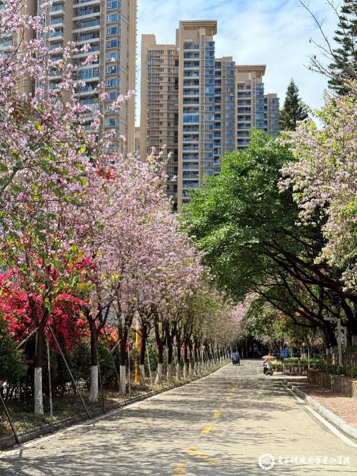 道旁繁花绽粉意,绿树葱茏伴高楼,铺展春日里的绿意通途。