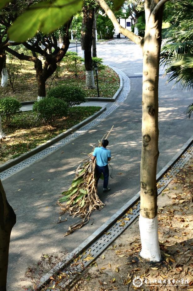 春日的阳光洒落在林间,莲峰后勤人员扛起枝叶前行。脚下,细碎的光影与新落的枝叶交织。