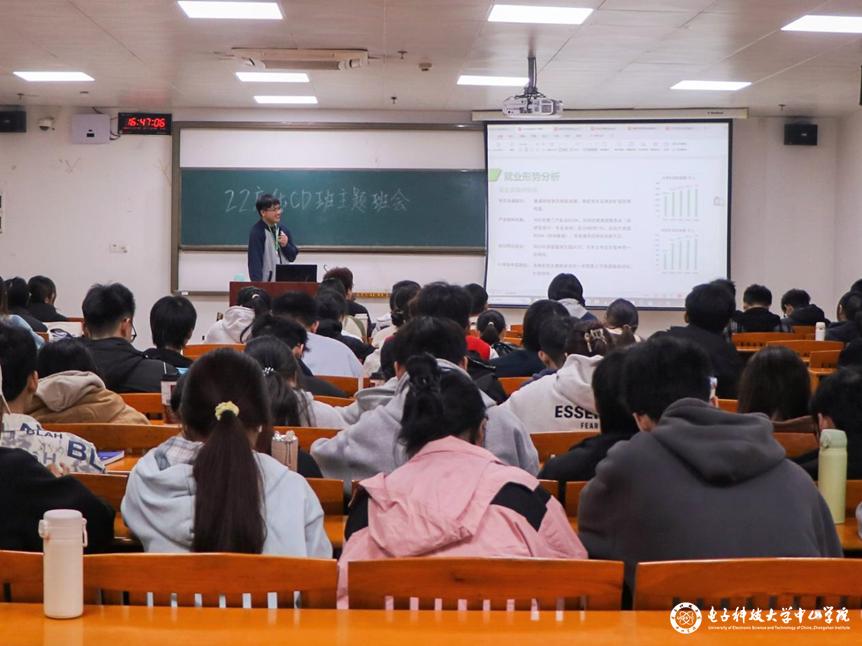 为帮助学生进一步了解职场,规划未来,材料与食品学院2022级应用化学CD班于3月18日下午在厚德楼A210教室开展了“职引未来”主题班会。班会上邀请了2019届毕业生黎广泉师兄为大家传职场经,送职规宝。材料与食品学院辅导员何瑞芝以及2022级应用化学CD班学生共80余人参加了本次主题班会。